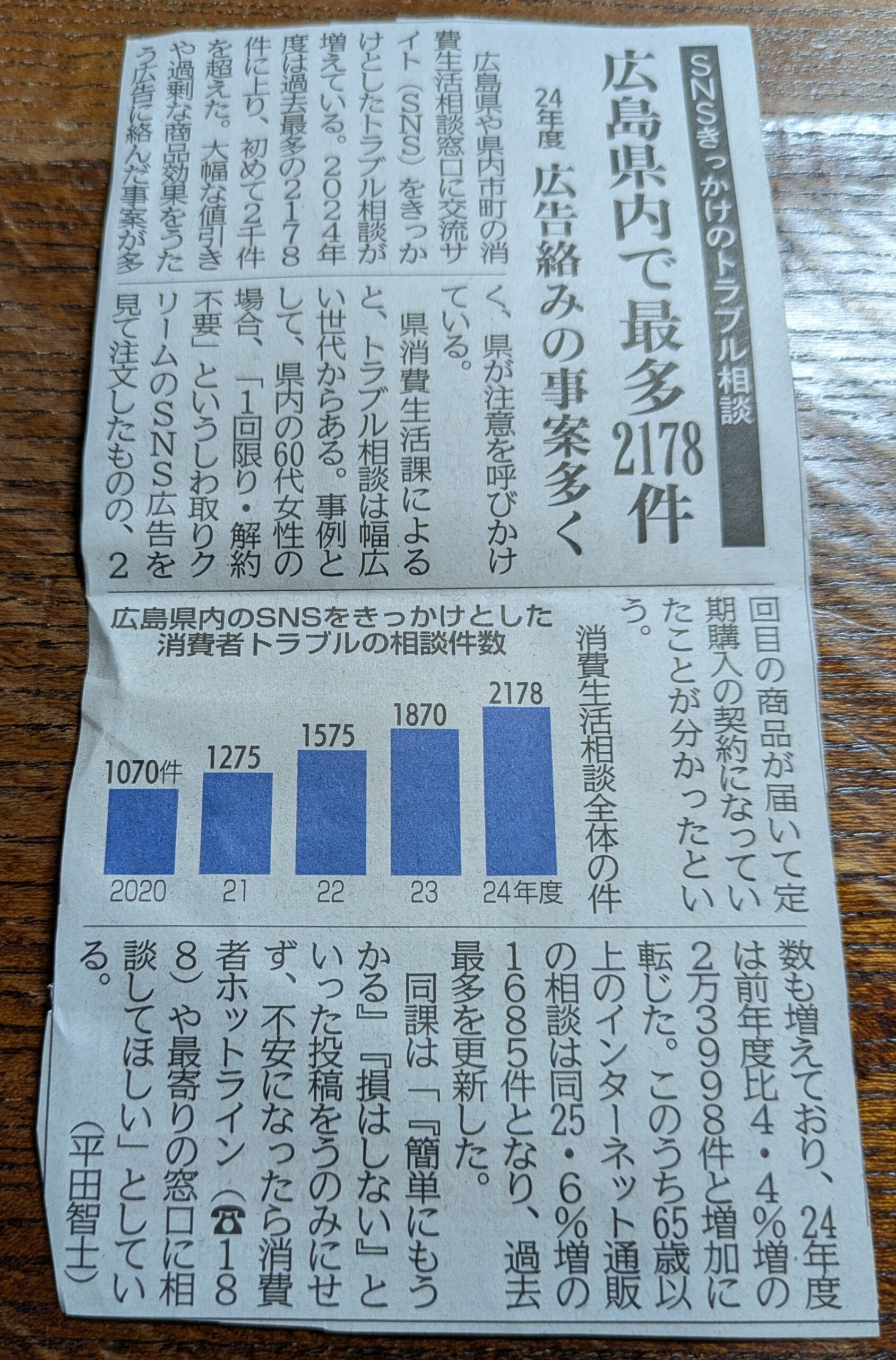 本日は、昨日8月26日付の中国新聞朝刊に掲載されていた、大変気になる記事についてお話しさせてください。 そこには、「広島県内で最多2178件」という大きな見出しで、SNSきっかけのトラブル相談に関する記事が掲載されていました。悪質なSNS広告や不当な契約など、様々な消費者トラブルが年々増加しているとのことです。 特に、高齢者の方々が巻き込まれるケースも多いと知り、胸が痛くなりました。 こうした情報弱者を狙った悪質な手口は、私たちの生活のすぐそばに潜んでいます。 だからこそ、私たちは、地域の皆様に安心してサービスをご利用いただくため、信頼関係を第一に考え、誠実に向き合うことが最も重要だと改めて感じました。 私たちKOYOプラスは、広島市/全区エリアを中心に、そして近隣エリアも含め、不用品処分や遺品整理、空き家管理といった様々な介護保険外サービスを提供しています。 お客様が抱える「お困り事」一つひとつに、直接顔を合わせ、丁寧にお話を聞かせていただくことで、安心をご提供できると信じています。 「おかしいな」と感じるサービスや業者に出会ったら、まずはご相談ください。 今回の新聞記事は、私たちにとって、改めて地域の皆様の暮らしを守るという使命を再確認させてくれる、大切な学びとなりました。 どんな小さな「困った」でも、どうぞお気軽にKOYOプラスにご相談ください。 今後とも、地域に寄り添うKOYOプラスを、どうぞよろしくお願いいたします。 最後までお読みいただき、ありがとうございました!