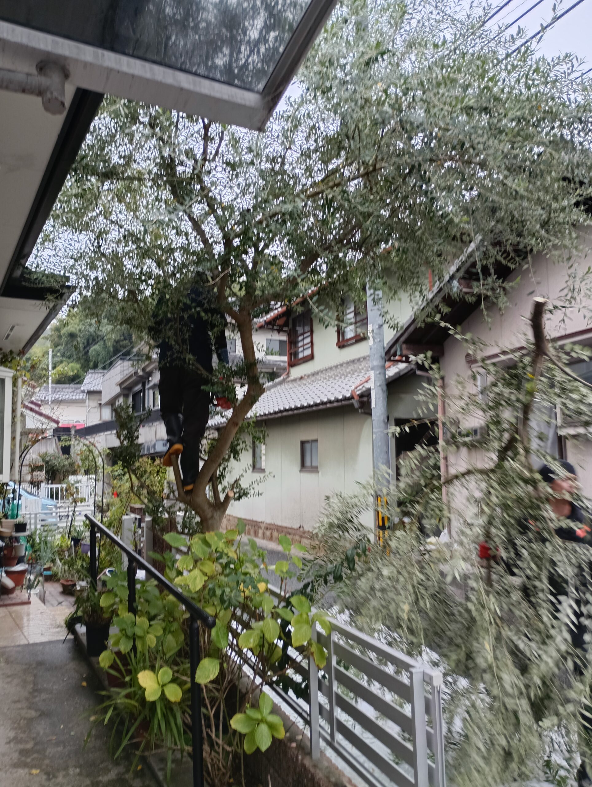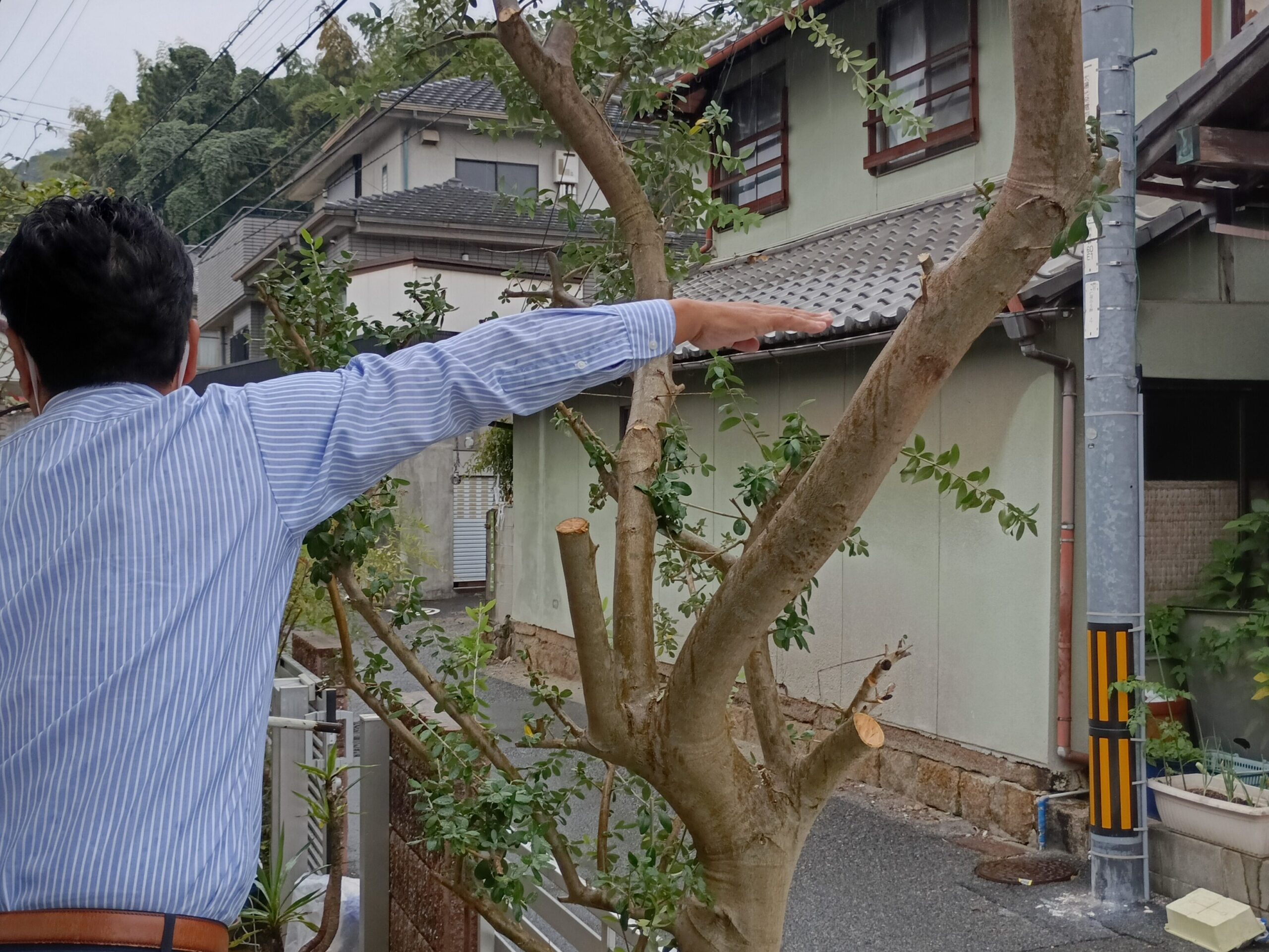 道路側に越境してしまった大きな木。お客様からの希望を聞きながら剪定していきます。