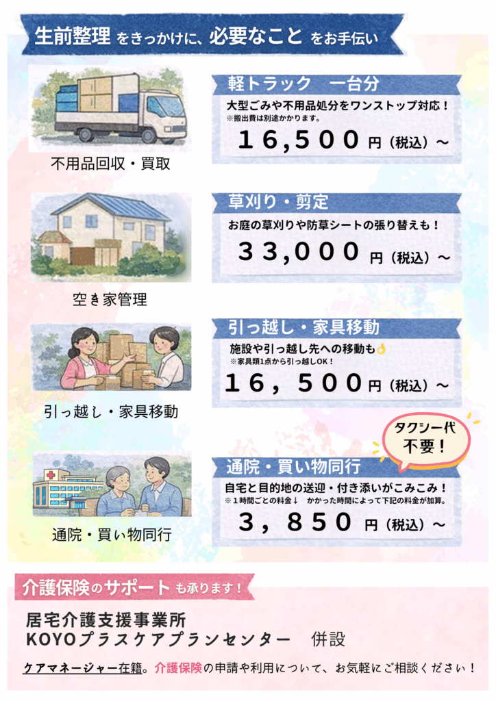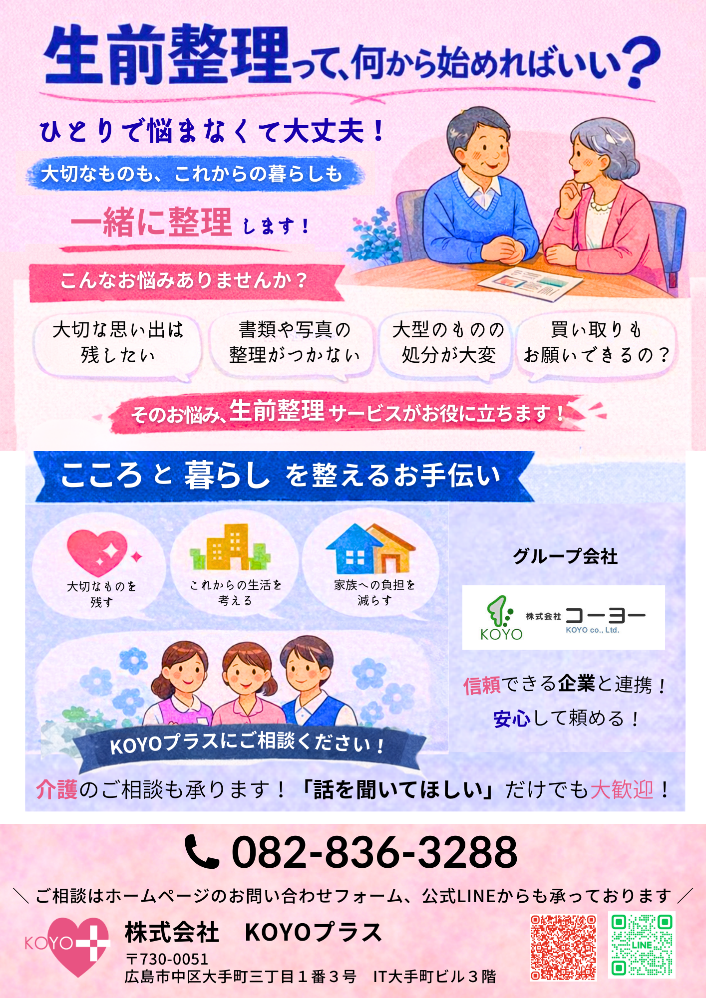 「生前整理って何から始めたらいい?」「どこにお願いしたらいい?」そんなお困り事に対してKOYOプラスができることをチラシにしました!